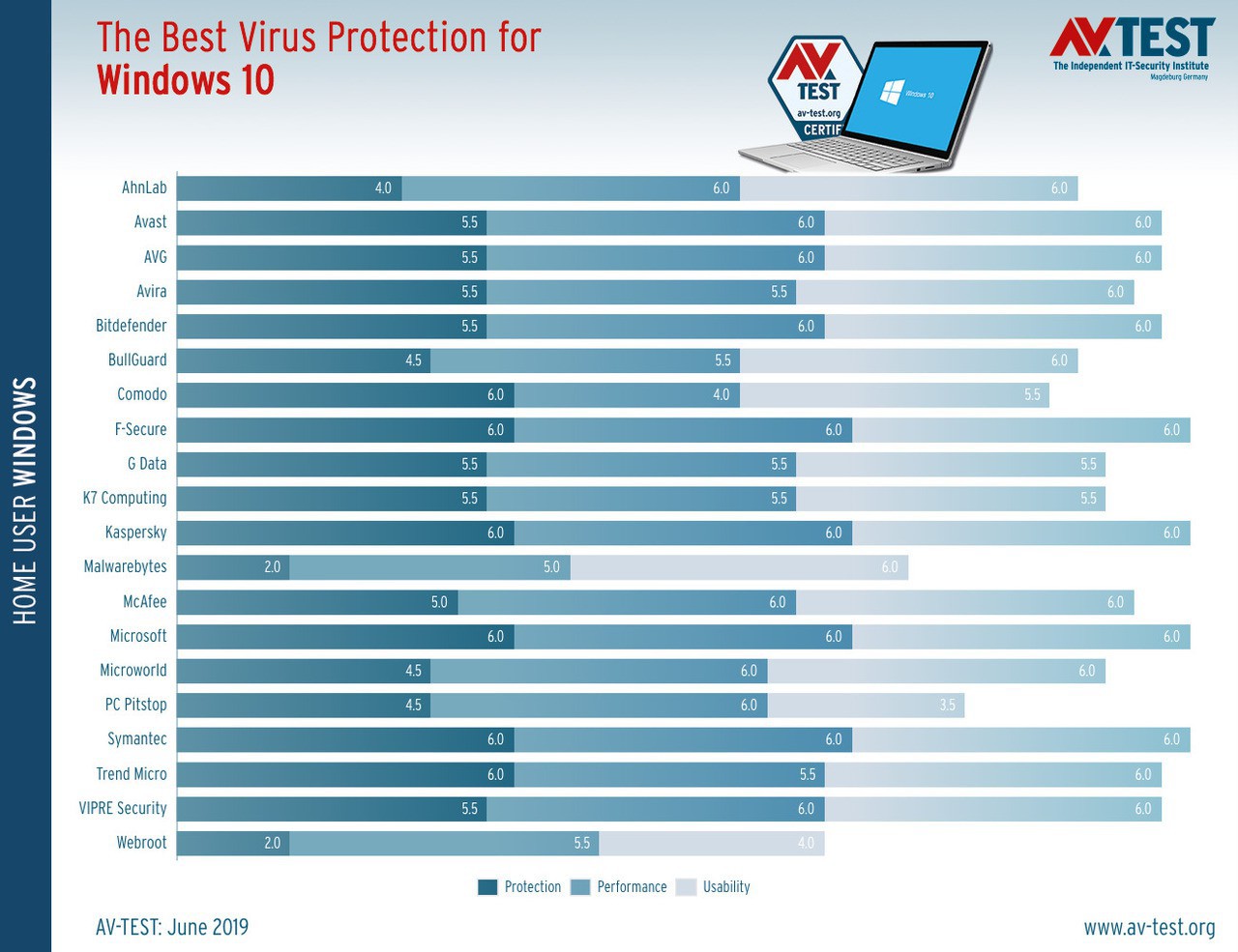 ドイツのセキュリティソフトウェア調査会社AV-TESTは7月30日、Windows 10のホームユーザー向けのアンチウイルスソフト製品を比較した2019年5月〜6月期の調査結果を発表しました(Softpedia)。