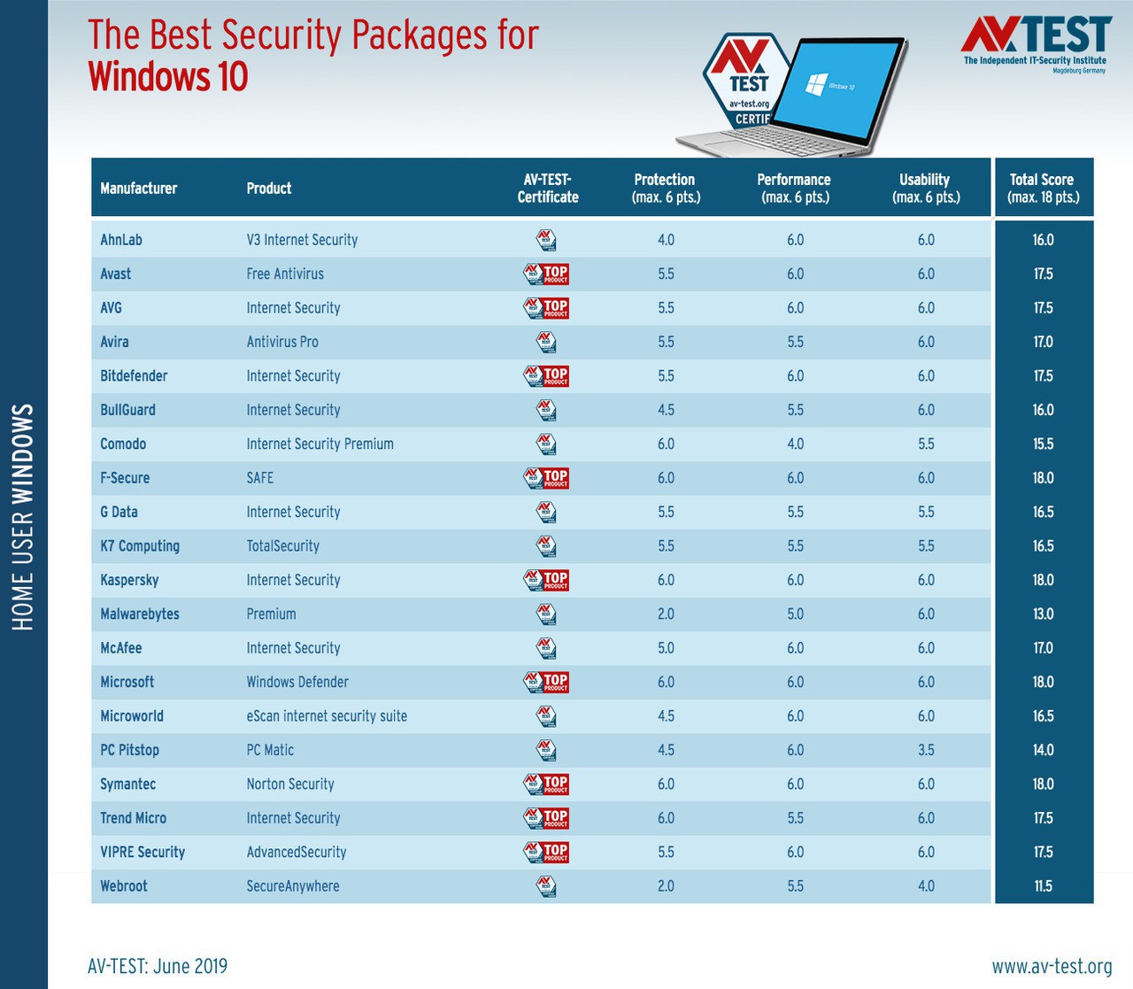 今回の調査では、Windows 10に標準で組み込まれている、MicrosoftのWindows Defenderが、ついに最高の18ポイントを獲得しトップとなっています。これ以外で最高点を獲得したのは、F-Secure SAFE、Kaspersky Internet Security、Symantec Norton Securityの3つ製品で、17.5ポイントでAvast Free Antivirus、AVG Internet Security、Bitdefender Internet Security、Trend Micro Internet Security、VIPRE Security AdvancedSecurityなどが続いています。