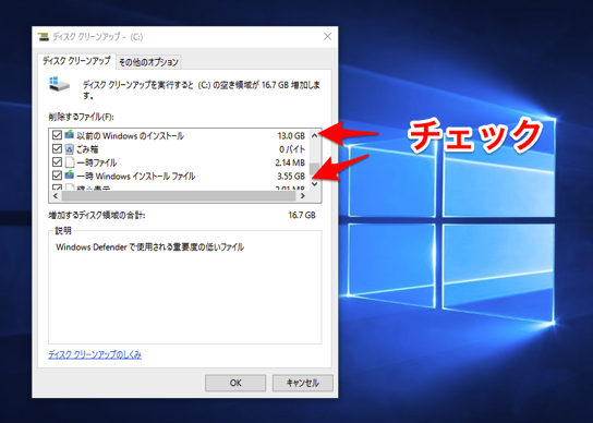削除するファイルとして、特に容量の多い「以前のWindowsのインストール」と「一時Windowsインストールファイル」をチェックし「OK」を押せば完了です。