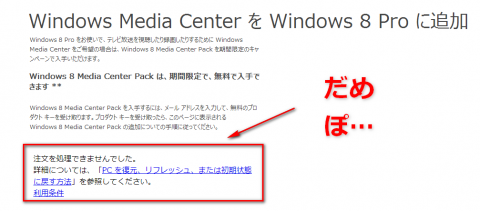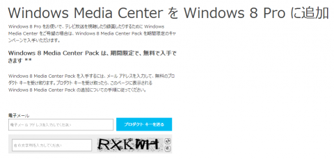 Windows 8 ではDVD再生用のコーデックが省略されたため、Windows Media PlayerでDVDの再生ができません(ASCII)。しかし、本日2013/1/31日まで期間限定無料で入手できる「Windows 8 Media Center Pack」をインストールすればコーデックが追加され再生できるようになるみたいです。早速メールアドレスを入力して申し込んでみました。
