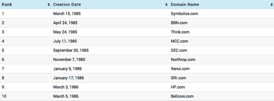 このリストによると1位は1985年3月15日に登録されたSymbolics.com。もともとSymbolics.comはLISPマシンを製造していた英国の会社のドメインだったようですが、現在投資会社の代表の個人ブログとして運営されているようです(世界で最も古いドメイン名は「Symbolics.com」、3月15日で28周年!!)。