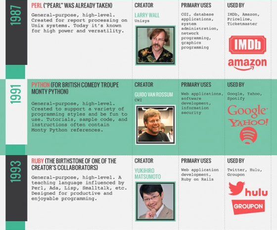 1987年にPerlが開発され(Wikipediaによると、Perl1.0が開発されたのは、1987年12月18日)。その後Python、Rubyが開発された事がわかります。一番右端に、そのプログラミング言語が採用されているプロダクトもリストアップされていて、Rubyは、Twitter、Hulu、Grouponなどで使われている事がわかります(Huluもそうだったのか…)。
