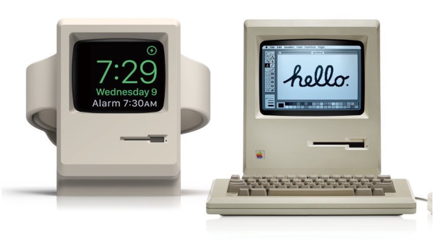傷がつかないシリコン素材を使って作られており、全てのApple Watch製品に対応。Apple Watchを充電しながら横向きに表示して使うことができるナイトスタンドモードを利用して、Apple Watchの時計面を、ミニMacintoshのディスプレイ部に表示することができます。