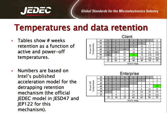 今回問題となっている、電源オフ時の保持時間も異なっており、クライアント用は30度で1年間の保持、エンタープライズ用は40度で3ヶ月の保持が必要となっています。