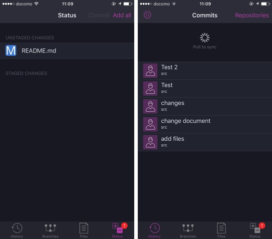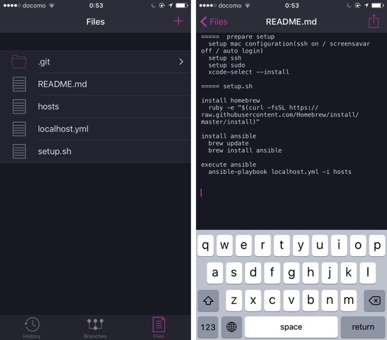 アプリを起動し、GitHubのアカウントを使って認証すると、自分の管理するリポジトリが一覧表示されます。リポジトリをタップするとそのリポジトリがiOSデバイス内にcloneされます。