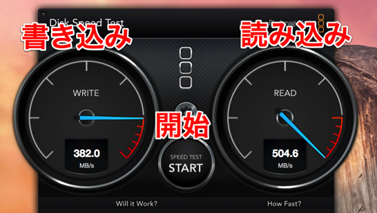 機能は、真ん中の「START」ボタンを押せば測定が始まるという極めてシンプルなもの。左側が書き込み速度で、右側が読み込み速度です。測定はもう一度「START」ボタンを押すまで無限に続くのでそこだけ注意してください。