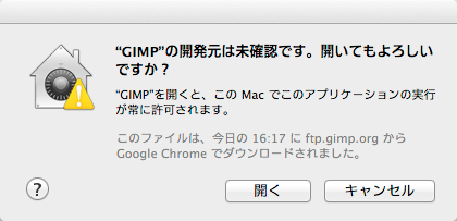 ここから、gimp-2.8.4-nopython-dmg-1.dmgをダウンロードし、中身のGIMP.appをアプリケーションフォルダにコピーします。
