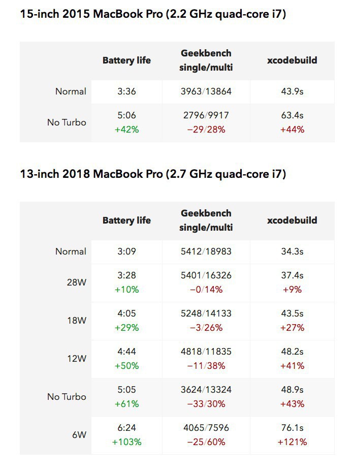 同氏は15インチのMacBook Pro 2015(2.2GHz quad-core i7)と、13インチのMacBook Pro 13インチ(2.7GH quad-core i7)を用い、Turbo Boostの有無あるいは消費電力ごとに、バッテリー持続時間や、GeekBenchスコア、xcodebuildの時間を比較しています。