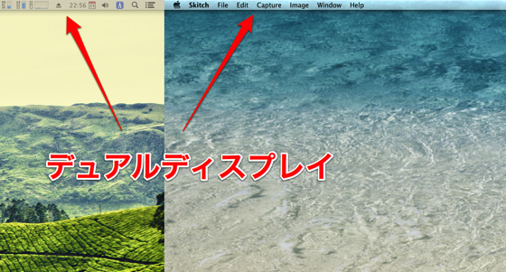 Mavericksではどちらのディスプレイにもメニューバーが表示されるようになりました。メニューを操作するのにわざわざ別のディスプレイまでマウスカーソルを移動する必要がないので便利です。アクティブじゃないほうのメニューバーは薄く表示されます。