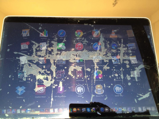コーティング剥がれ問題は、2012〜2014年型Retina MacBook Proで採用されている、反射防止コーティングが剥がれてしまう問題です(2015 MacBook proに関しては不明)。今のところ原因ははっきりしていませんが、キーボードやトラックパッドがディスプレイに接触した際に生じる微小な傷や、画面を掃除するためのクリーニングクロスが原因ではないかと推測されています。典型的な症状はディスプレイの端のコーティングが一部剥がれてしまうことですが、中には最初の画像のように全面がひどく剥がれてしまった状態の写真も投稿されています。