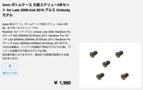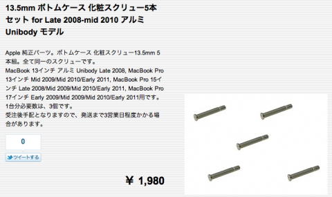 […] ソフトアンテナブログさんの“ユニボディMacBookProのネジ入手方法”で純正部品の購入サイトを紹介しています。やっぱアルミ製の+ネジは恐いですよね。あの大きさじゃ落とした瞬間な […]
