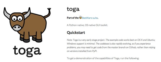 特に「Your first Toga app」にはデモアプリよりさらに簡単な以下のサンプルプログラムが掲載されているので参考になると思います。