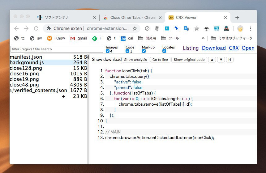 ただしClose Other Tabsはスクリーンショットも掲載されておらず、最終更新2012年8月14日というあまり活発に開発されていない拡張機能のようです。念のためソースコードを確認してみたところ以下のようなシンプルなものでした。