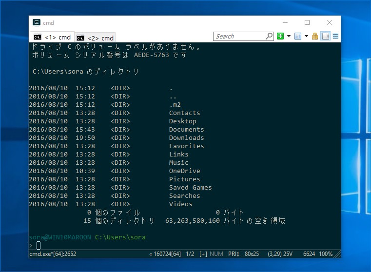 ConEmuを起動すると、デフォルトシェルとして設定されているWindows標準のコマンドプロンプトが立ち上がります。