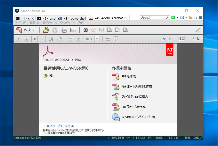 ▲メインメニューの「Attach to」を実行すると、起動中のウィンドウまたはコンソールが一覧が表示されます。埋め込みたい項目を選択するとタブの内部にそのウィンドウが表示されます。上の画像はAdobe Acrobatを埋め込んでみたところです。ウィンドウが増えすぎて困っている場合に使うと便利な機能かもしれません。