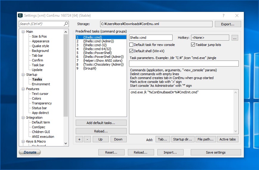 ▲設定画面では「Startup > Tasks」から変更できるタスクの設定以外にも、ウィンドウのサイズや位置、外観、タブバーのスタイル、キーボードショートカット等、膨大な項目をカスタマイズすることができます。