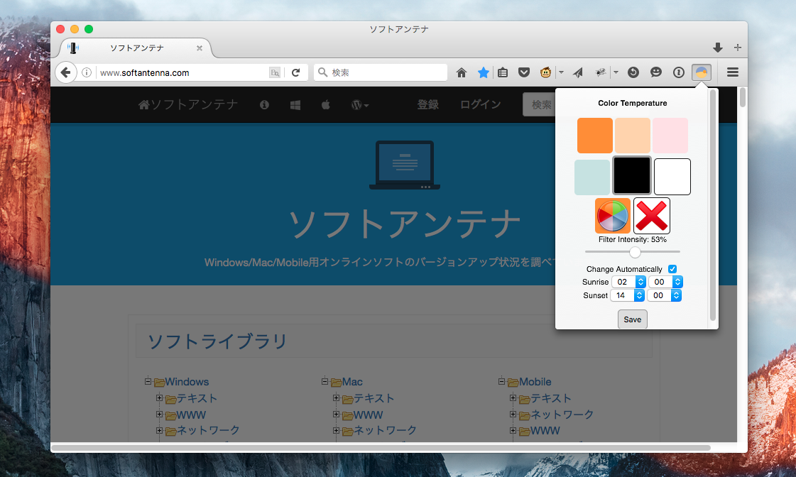 WindowsやMacではf.luxというソフトが有名なこの機能を、Firefox上でだけ実現するアドオン「Firelux」が公開されています。