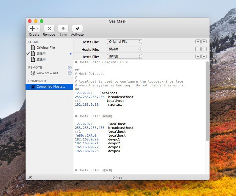 ▲左上の+アイコンをクリックして「Local」「Remote」「Combined」という三種類のhostsファイルを追加することができます。追加したhostsファイルは「Activate」ボタンをクリックするだけで簡単に切り替えることができます。
