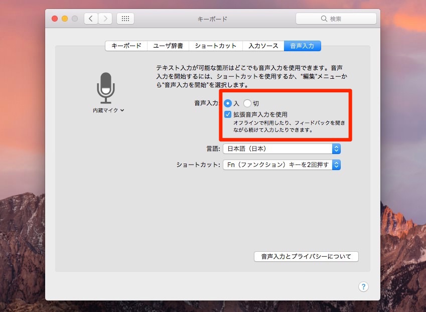 「システム環境設定 > キーボード > 音声入力」で「音声入力」を「入」にして「拡張音声入力を使用」にもチェックを入れておきます。