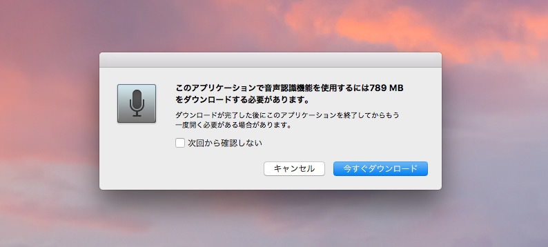 HeySiri-macOSを起動すると音声認識機能を使用するための追加のファイルのダウンロードが始まります。789MBもありますのでしばらく時間がかかります。