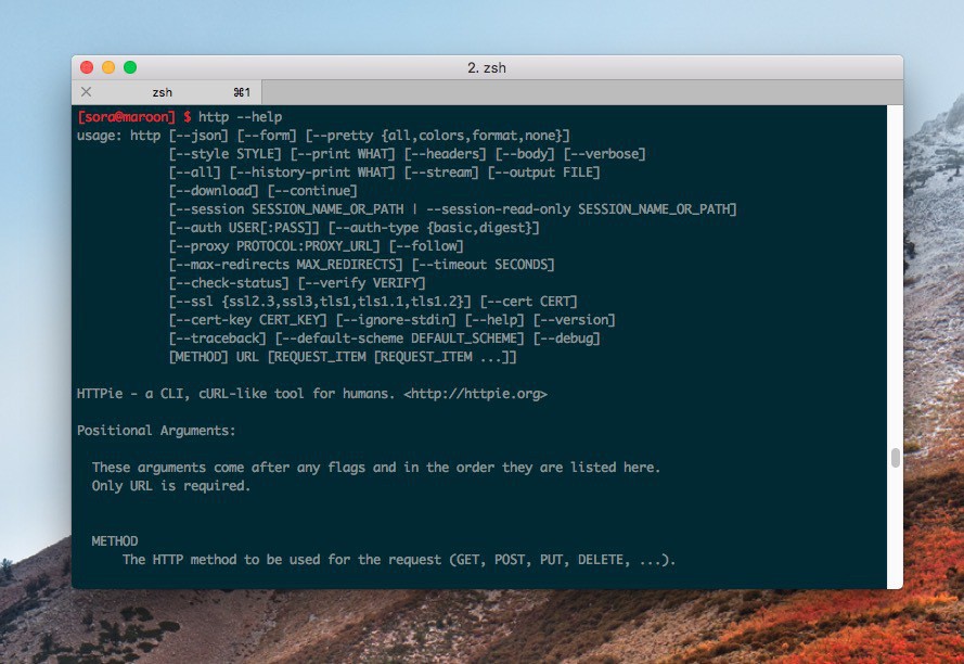 インストールが完了すれば、ターミナルで「http」コマンドが利用可能になります。httpieのコマンド名は「httpie」ではなく「http」なので注意が必要です。