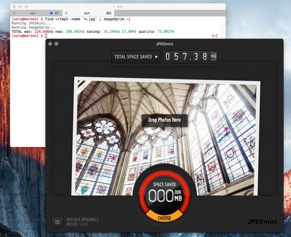 ImageOptim-CLIを使用すればJPEGmini for Macを利用した圧縮処理を自動化することができます。実行中はデスクトップにJPEGminiが立ち上がり、自動操作の邪魔をするとうまく動かなくなるという欠点がありますが、作業効率化を図ることはできそうです。