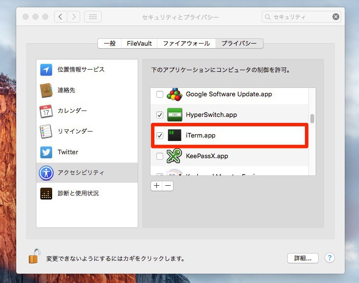 JPEGminiを組み合わせる場合、システム環境設定を起動し「セキュリティとプライバシー > アクセシビリティ」からiTerm.appやTerminal.appを登録しておきます。