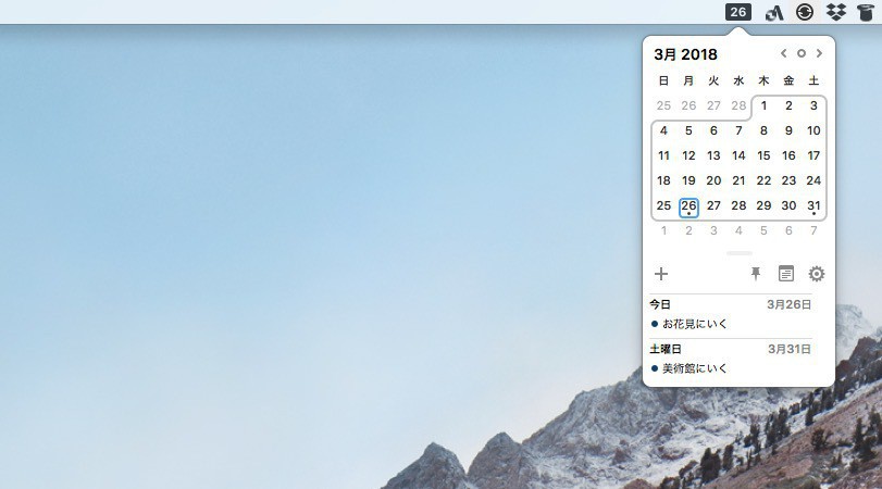 実行するとメニューバーに日付のアイコンが表示され、クリックすると月間カレンダーおよびイベントが一覧表示されます。新しく予定を追加することもできるので、大抵の作業はこのアプリだけで済ませることができるかもしれません。