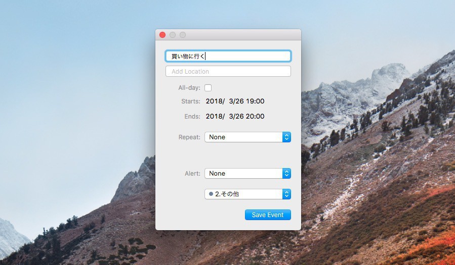 ▲+ボタンをクリックすると予定の追加画面が表示されます。予定のタイトルの他、場所や時間(矢印キー上下で変更できます)、繰り返し設定、追加するカレンダーが選べます。