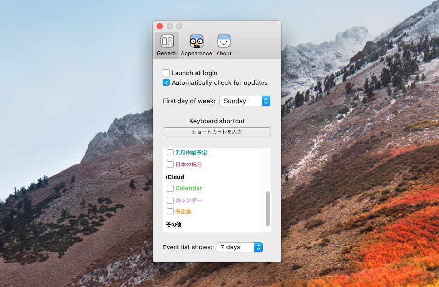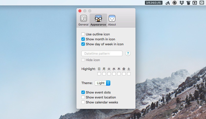 ▲設定画面の「Preferences > Appearance」では外観を変更できます。メニューバーのアイコン表示や、カレンダーの表示をカスタマイズすることができます。