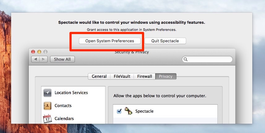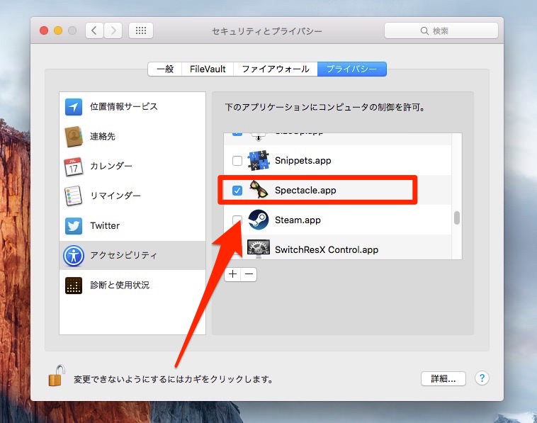 カギをクリックしてパスワードを入力。Spectacle.appにチェックを入れれば完了です。
