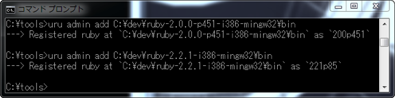 uru admin add C:\dev\ruby-2.0.0-p451-i386-mingw32\bin uru admin add C:\dev\ruby-2.2.1-i386-mingw32\bin