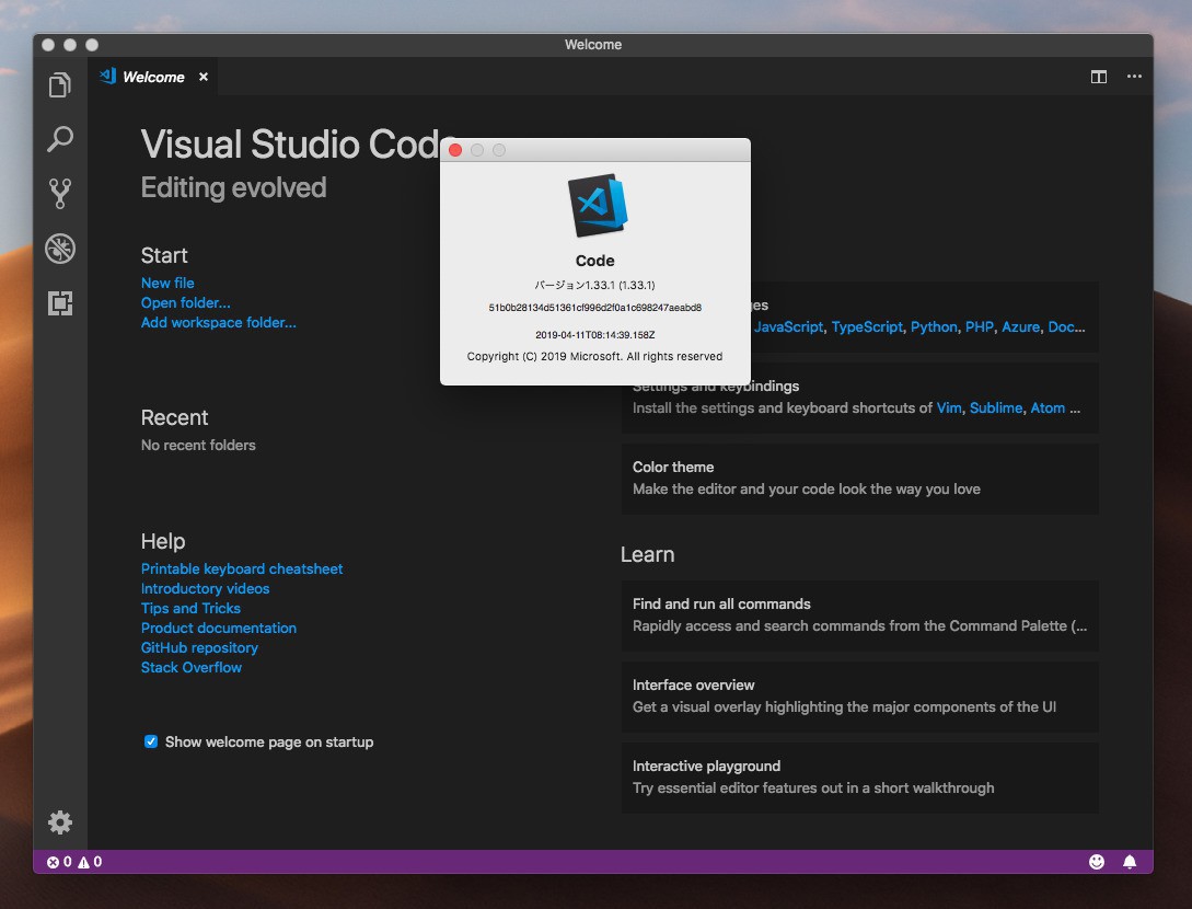 ▲about画面のアイコンやタイトルが異なりますが、Welcomeページの表示は「Visual Studio Code」のままになっていることがわかります。