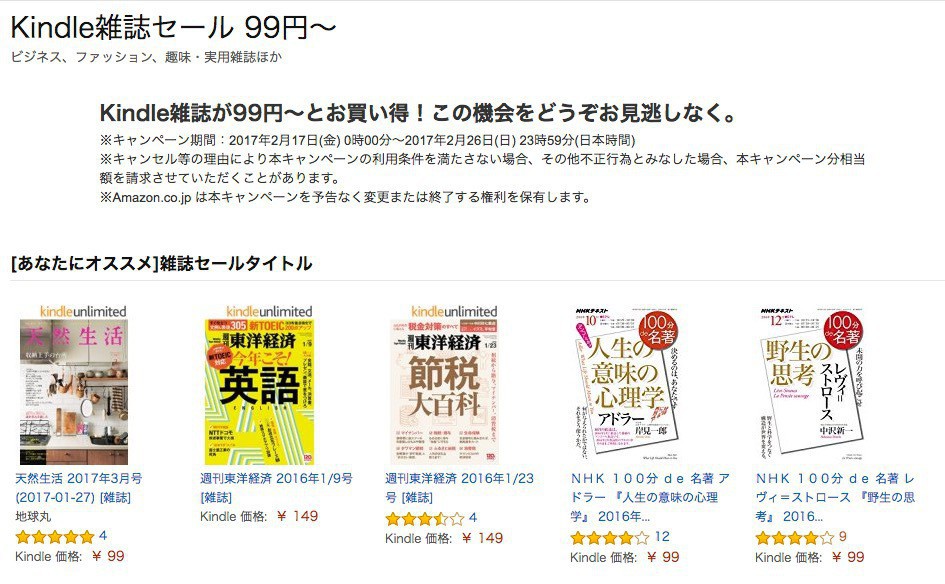 AmazonのKindleストアで現在、Kindle雑誌4,231冊を対象とした「Kindle雑誌セール 99円~」が開催されています。セール期間は2017年2月17日(金) 0時00分~2017年2月26日(日) 23時59分まで。