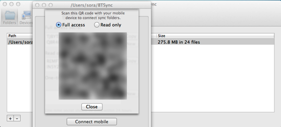 そうです。デスクトップ版BitTorrentSyncのフォルダのQRコードです。同期中のフォルダを選択して右クリックし「Show folder preferences」でプロパティ画面を表示。「Connect mobile」をクリックするとQRコードが表示されます。