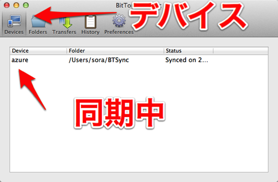 BitTorrent Syncのメイン画面を開き(メニューバー→Open BitTorrent Sync)、デバイスタブに1台目のMacの名前が表示されていれば同期準備完了です。