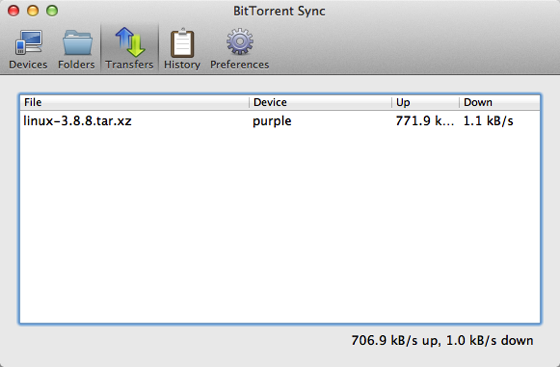 同期フォルダ(~/BTSync)に適当にファイルを置いてみると同期が始まります。同期の進捗状況はTransfersタブで確認可能。