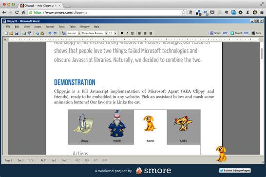 「Clippy.js」は、Windows XPでファイルを検索する時などに現れる謎の犬マスコット(=Microsoft Agent)をJavaScriptで完全再現したものです(GitHub、Hacker Newsで最近紹介されていたけど、ブックマークを確認すると、2013年5月くらいに生まれたものらしい)。