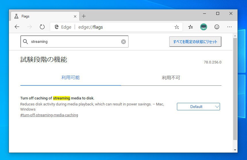 このフラグを有効にすると、ストリーミングメディアのキャッシュが無効になり、ノートPC等ではバッテリーの持続時間が向上することが期待できます。ただしデメリットも存在しキャッシュが利用されないことで、低速のインターネット接続を利用している場合は問題が発生することも考えられます。