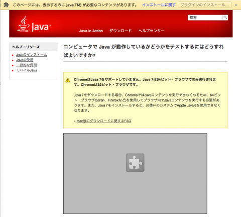 無効の場合上の画像のような表示になるかと。以前もJavaの脆弱性がニュースになっていたしほんと必要ないならJavaプラグインは使わないにこしたことはないですね。危険だ。
