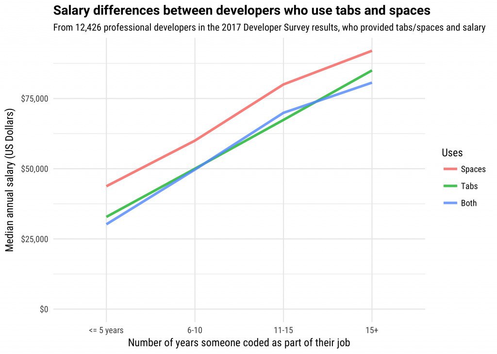 調査に協力した28,657人はプロの開発者で(学生や以前の開発者ではなく)、40.7%がタブを、41.8%がスペースを使用していると回答。そのなかの12,426人は報酬額についても回答していて、タブ派の開発者は43,750ドルだったのに対し、スペース派の中央値は59,140ドルだったと回答しているのです。