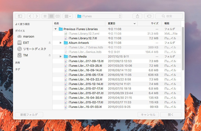 ▲「Previous iTunes Libraries」フォルダが開くので、iTunes 12.6で使用していた最新のitlファイルを選べば完成です。