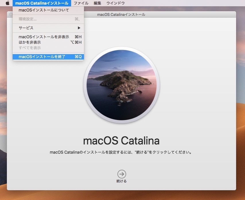 ▲メニューから、あるいは「Command+Q」をクリックしてインストーラーを終了させます。