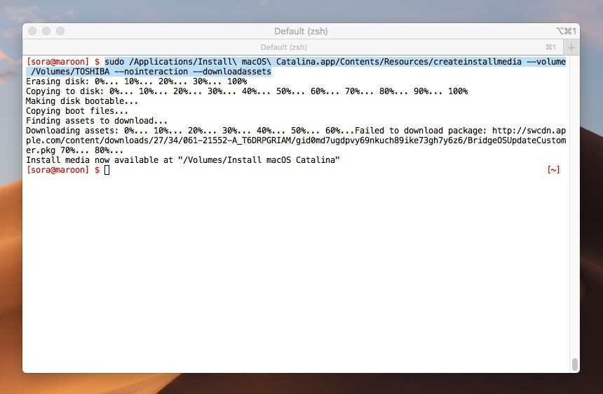 sudo /Applications/Install\ macOS\ Catalina.app/Contents/Resources/createinstallmedia --volume /Volumes/TOSHIBA --nointeraction --downloadassets