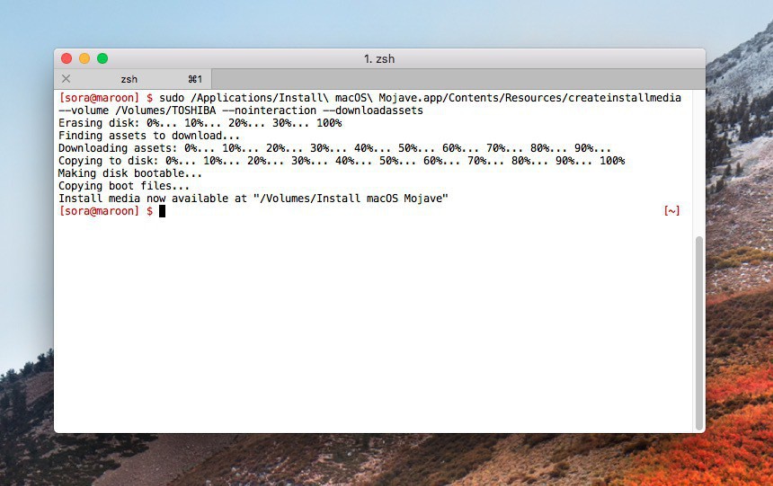 sudo /Applications/Install\ macOS\ Mojave.app/Contents/Resources/createinstallmedia --volume /Volumes/TOSHIBA --nointeraction --downloadassets