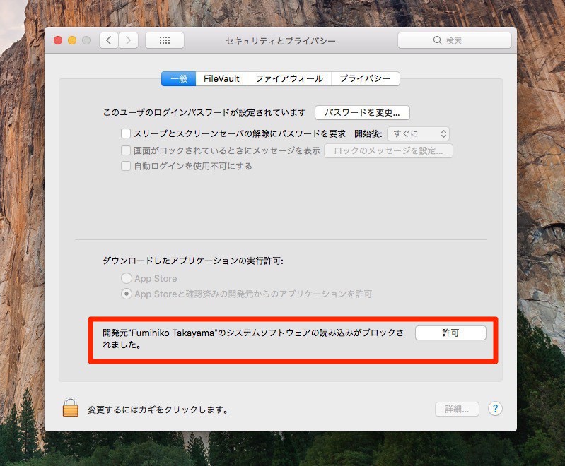 ▲許可するには「システム環境設定 > セキュリティとプライバシー」の「一般」タブを利用します。画面の一番下に「〜のシステムソフトウェアの読み込みがブロックされました」とあるのでその横の「許可」ボタンをクリックします。