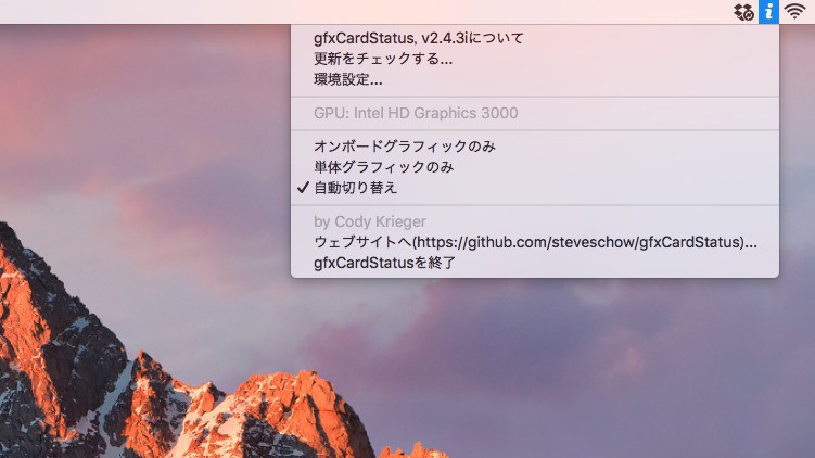 dGPUの動作状況を確認するツール「gfxCardStatus」を使用している場合、macOS Sierra対応版のgfxCardStatus.iを使用するのが重要です。そうしないとgfxCardStatus自体がdGPUを起動するという困った状態になってしまうからです。