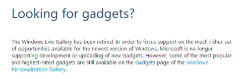 Windows Vista / 7 用のデスクトップガジェットが、配布サイトgallery.live.comがらダウンロードできなくなっているようです。アクセスすると「Looking for gadgets?」というページにとばされてしまいます。