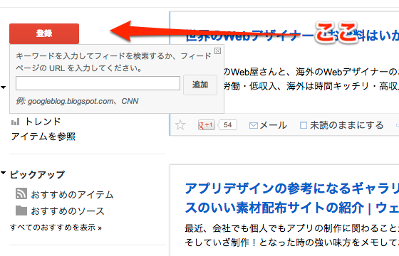 Google Readerの場合、左上の[登録]ボタンを押せば直でURLが登録できるので、これでOKです。