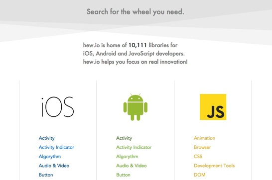 hew.io」は、GitHubにある1万個以上のiOS / Android / JavaScriptライブラリを専門としたサーチサイトです。文字列で自由に検索できるだけではなく、カテゴリ分けされているので、眺めるだけで有用なライブラリを見つけることができるかもしれません。